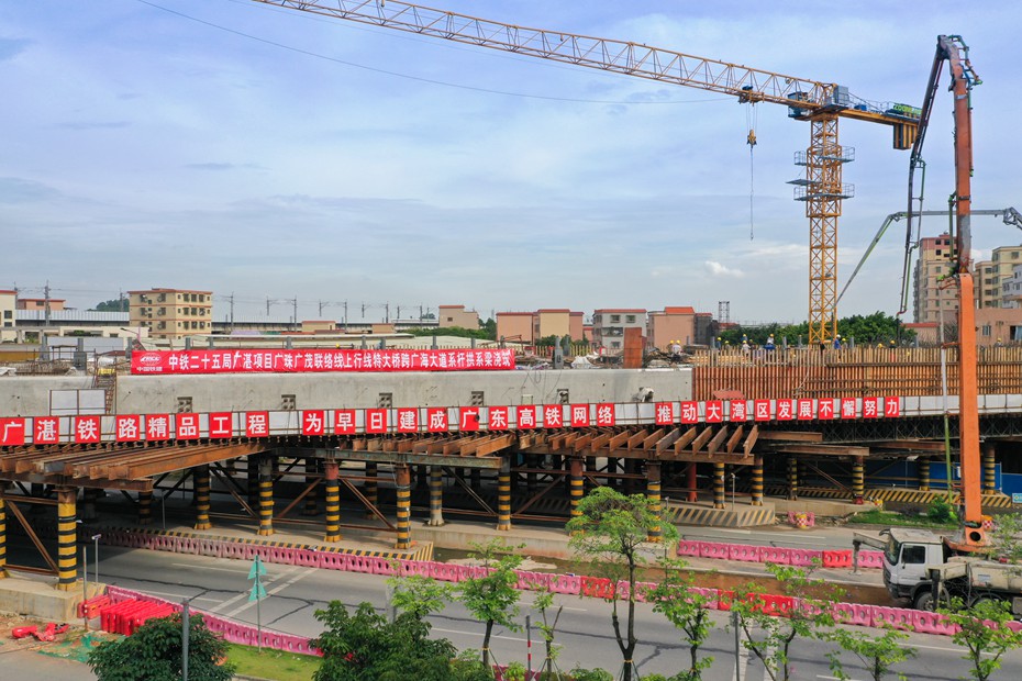 6月1日凌晨3时,经过近12个小时的连续作业,由广湛公司建设、中铁二十五局承建的广湛高铁广珠广茂联络线上行线特大桥跨广海大道120米系杆拱系梁成功浇筑,这是广湛高铁首座完成浇筑的系杆拱系梁,为加快项目建设进程打下坚实基础。