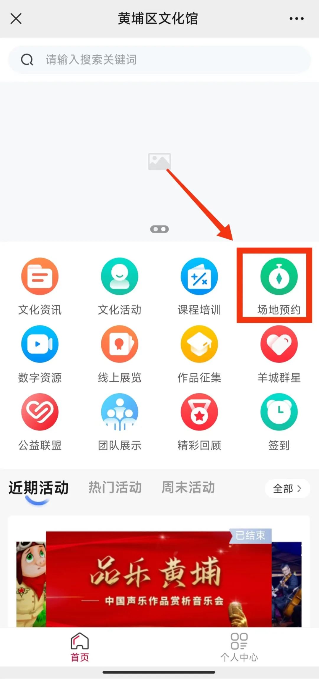 2. 进入“微馆家”后,“场地预约”;