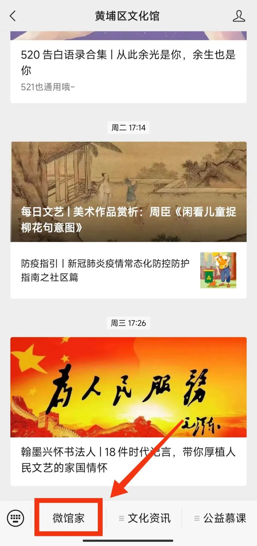 1. 进入黄埔区微信公众号,点击菜单栏“微馆家”;