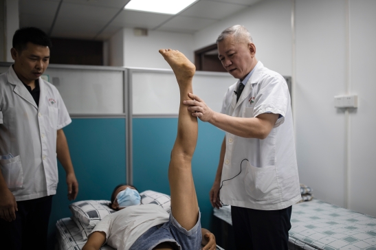 广州医科大学附属中医医院里,龙氏治脊流派的中医师李良看起来则又是另一种沉默高手,这种手法以“稳、准、轻、巧”为特点,腰椎斜扳、摇腿、揉腰等一套牵拉抖动的复位手法下来,看似轻巧,每次定格却都能感受到其中的力量充盈饱满。30岁的余小姐因孕产后骨盆错位导致严重腰骶痛——民间俗称“产后风”,甚至因此变得有点长短腿,经过8次治疗后,已不再有明显症状。