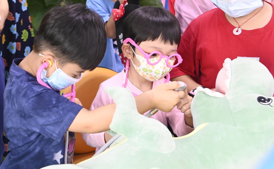 在口腔健康科普小讲座环节,广医口腔儿童口腔科医生、儿童口腔健康体验馆负责人米会会医生给小朋友带来儿童口腔保健科普小讲座,通过对牙齿结构的介绍、龋齿如何发生及预防,来教小朋友了解如何正确地刷牙,还争相当上了“小牙医”,为恐龙毛公仔的巨齿进行了“检查”和“治疗”,过了一把当牙医的瘾。