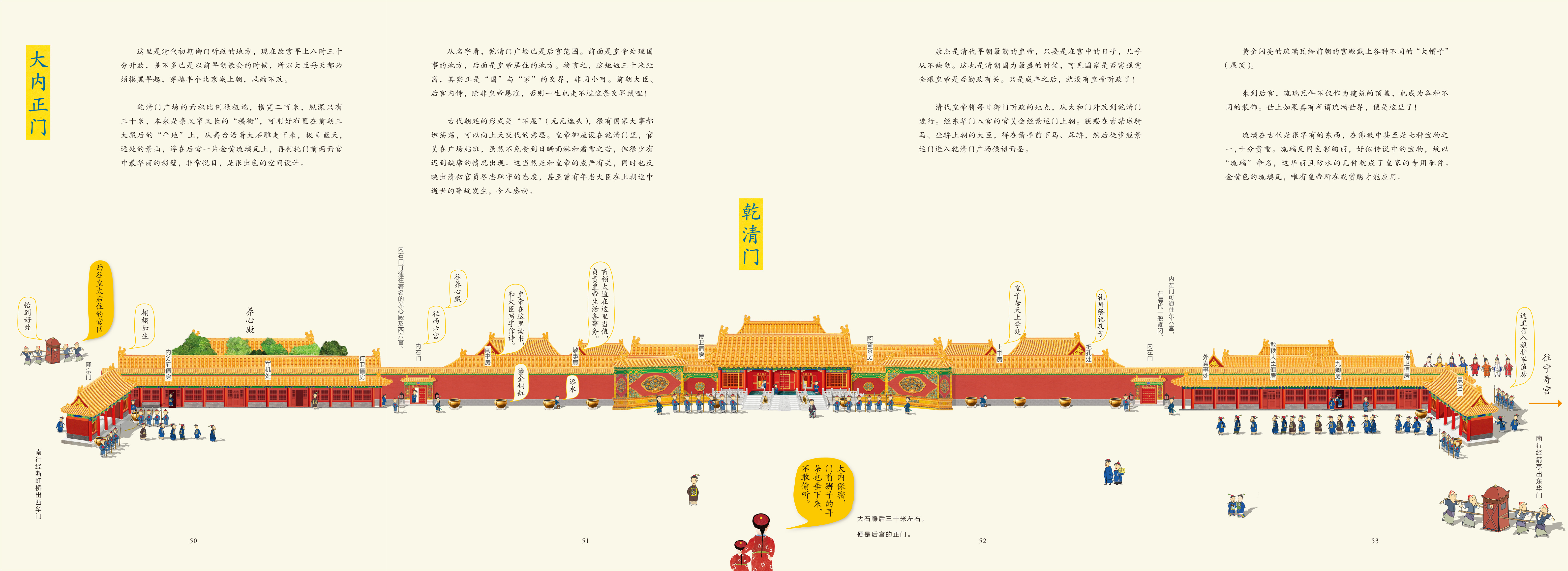 赵广超以其极具辨识力的视觉语言,充分利用卡通动漫、仿古长卷、清雅线描等多种艺术形式,诙谐讲述“昔日紫禁城”和“今日大故宫”,以及存在于两者间数百年的人事起伏,通过绘本故事、三字经韵文、皇帝生活详解、紫禁城全解析四个阶段,让不同年龄的读者可以一起阅读、学习、成长,并“让将来的您,用您将来的方式,带到您的小朋友的世界里”。