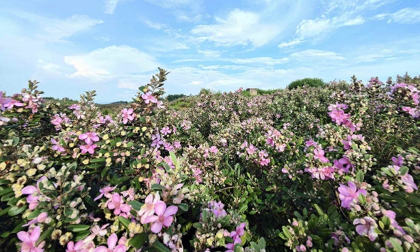 记者从山坡上望去,只见连绵几个山头的一棵棵山稔树上开满了花,白的、粉的花朵缀满了枝头,空气中弥漫着淡淡的香气,惹得一只只小蜜蜂忙着采花蜜。壮观的美景也吸引不少游客特地赶来观赏。