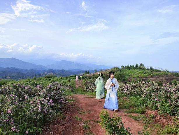 “稔子花好美,粉粉嫩嫩的,隔远看就像桃花一样。”游客胡翠萍和朋友,身穿汉服特意来到这里,一边赏花一边拿出手机拍短视频,记录下这美丽的风景。