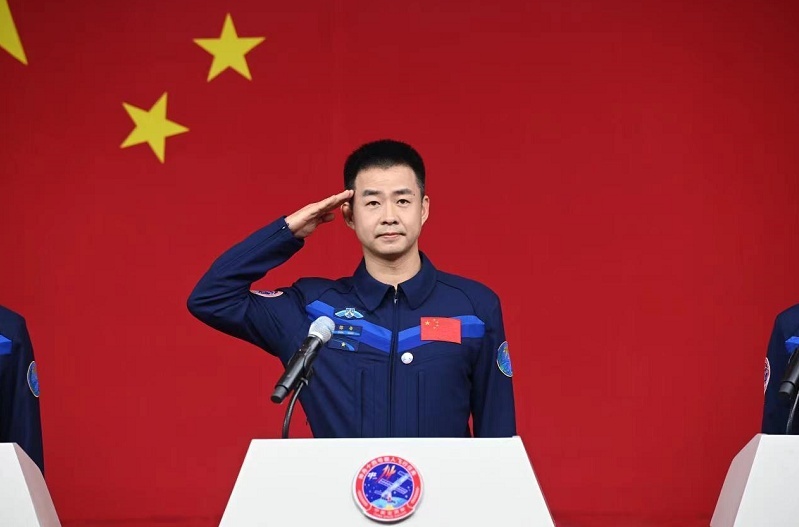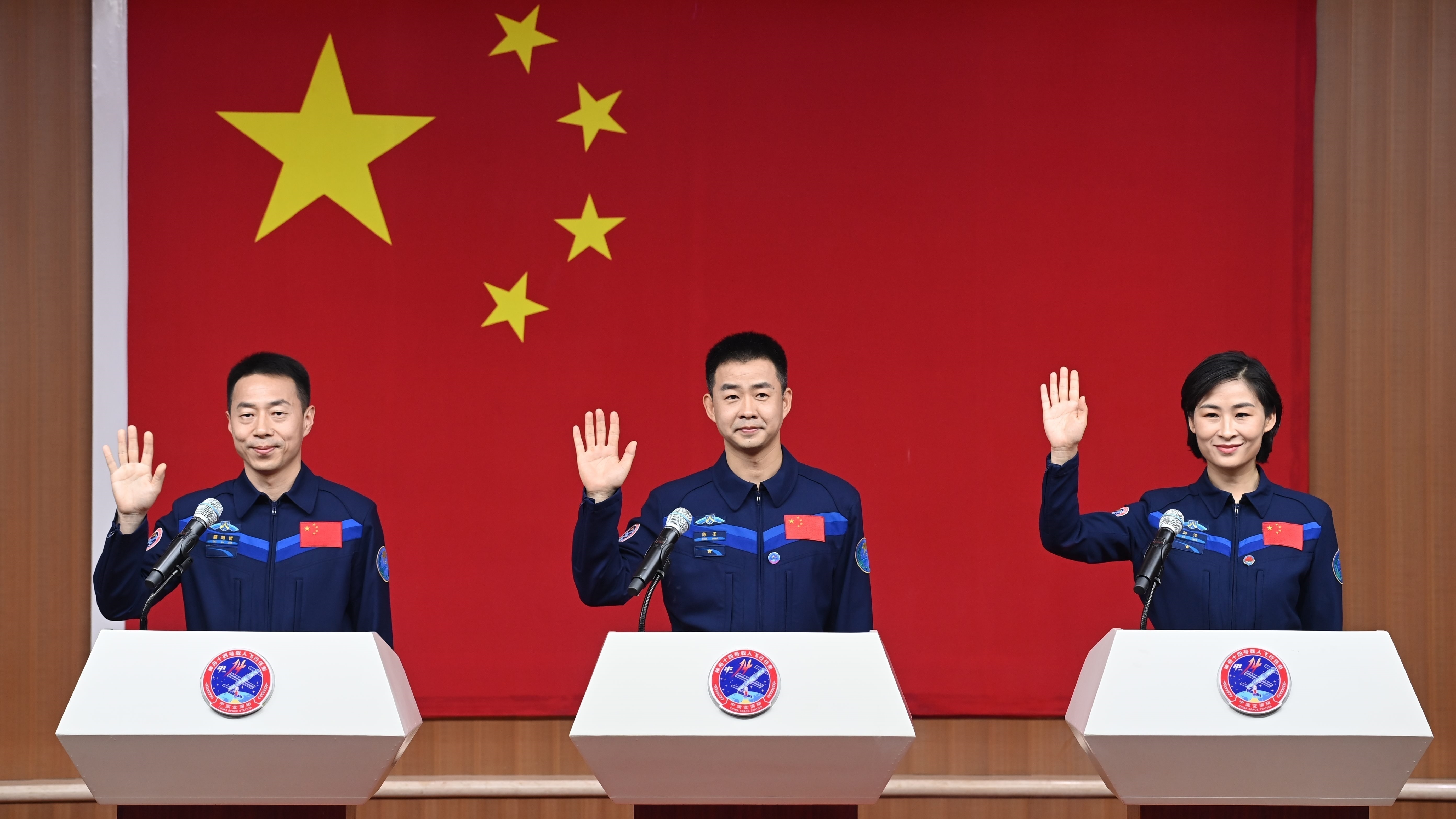 6月4日11时,执行神舟十四号载人飞行任务的三名航天员陈冬、刘洋、蔡旭哲,在酒泉卫星发射中心问天阁集体亮相并回答了记者提问。