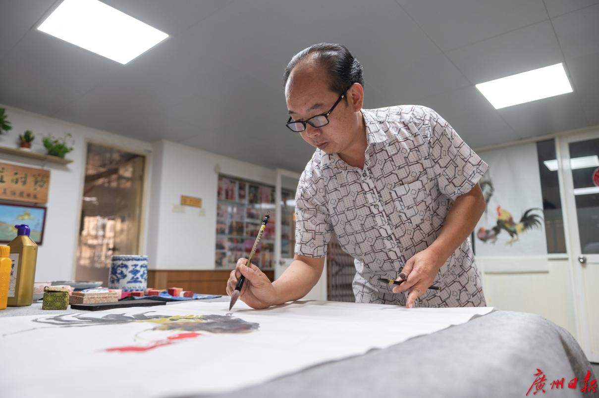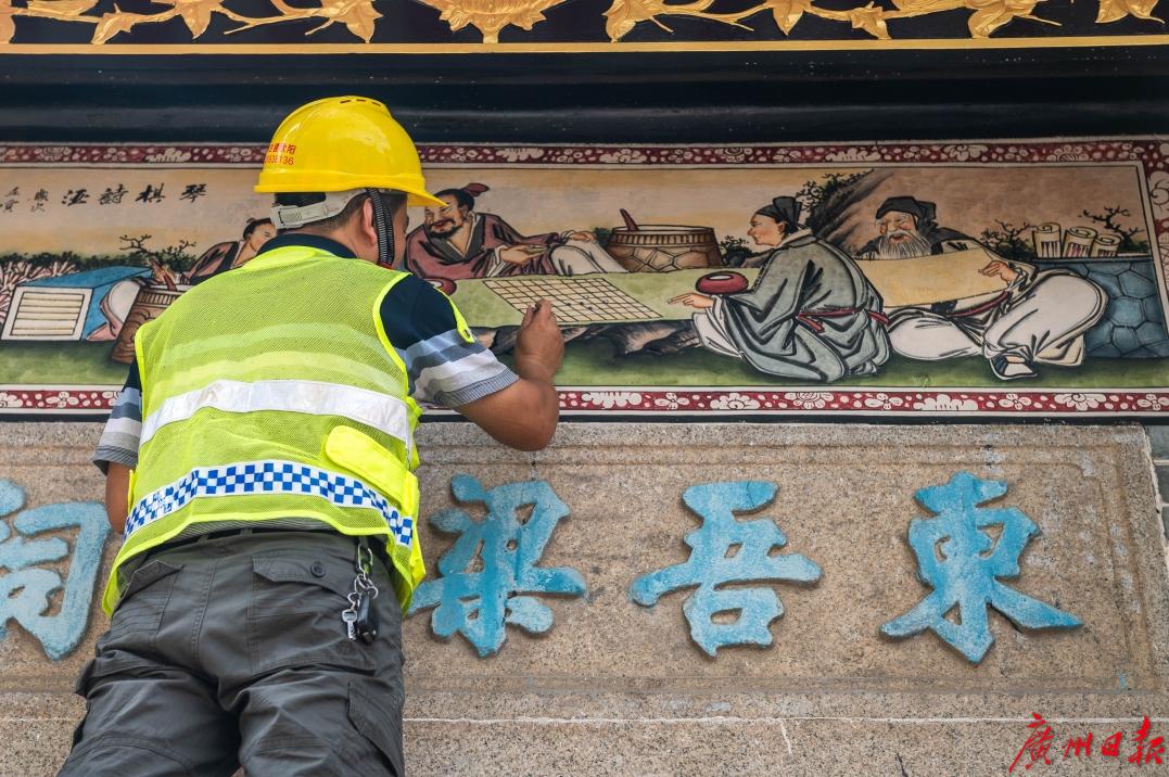 在广州鹿步大街,沿街数座祠堂正在进行修缮,这片区共8座祠堂有壁画需要修复或重绘,壁画匠人陈初敏、欧阳可朗稳稳地站在脚手架上,全神贯注地对一幅壁画作品进行修复收尾。“这里绘制的是琴棋诗酒图,原壁画损毁了,我们根据遗留痕迹,严谨考证后进行了修复。”陈初敏说,他从事壁画修复20多年了,跑过广东、广西、湖南等地,“我的手机里存了数百张各地壁画作品图片,很多是前辈名家的手笔。方便我学习技法、布局、构图,琢磨不同区域文化赋予壁画作品的不同风格。”