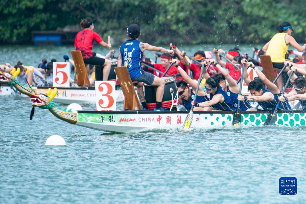 6月3日,參賽隊伍在2022澳門國際龍舟賽中角逐。新華社記者 張金加 攝