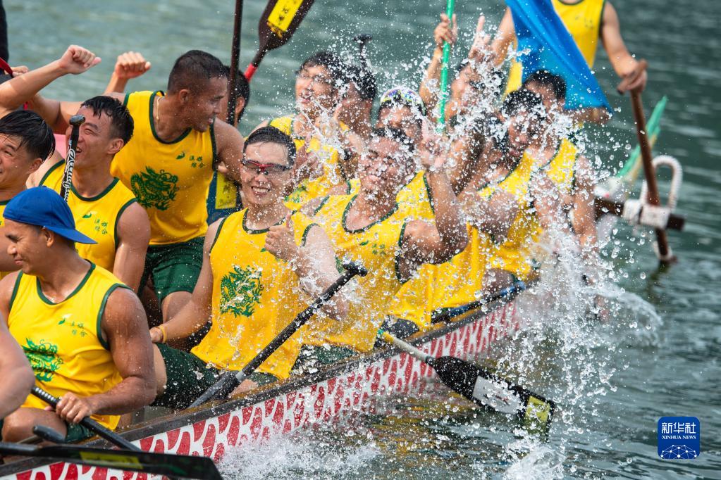 6月3日,參賽隊伍在2022澳門國際龍舟賽中慶祝。新華社記者 張金加 攝