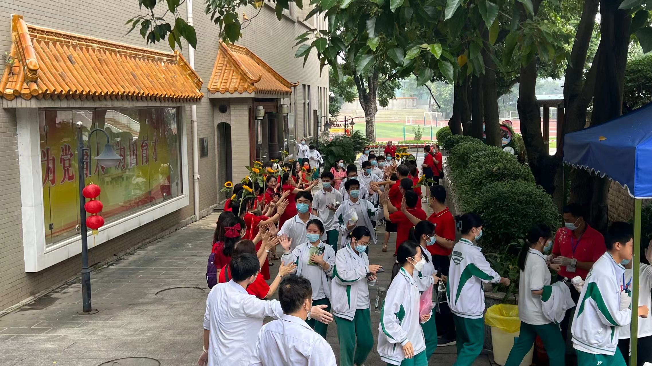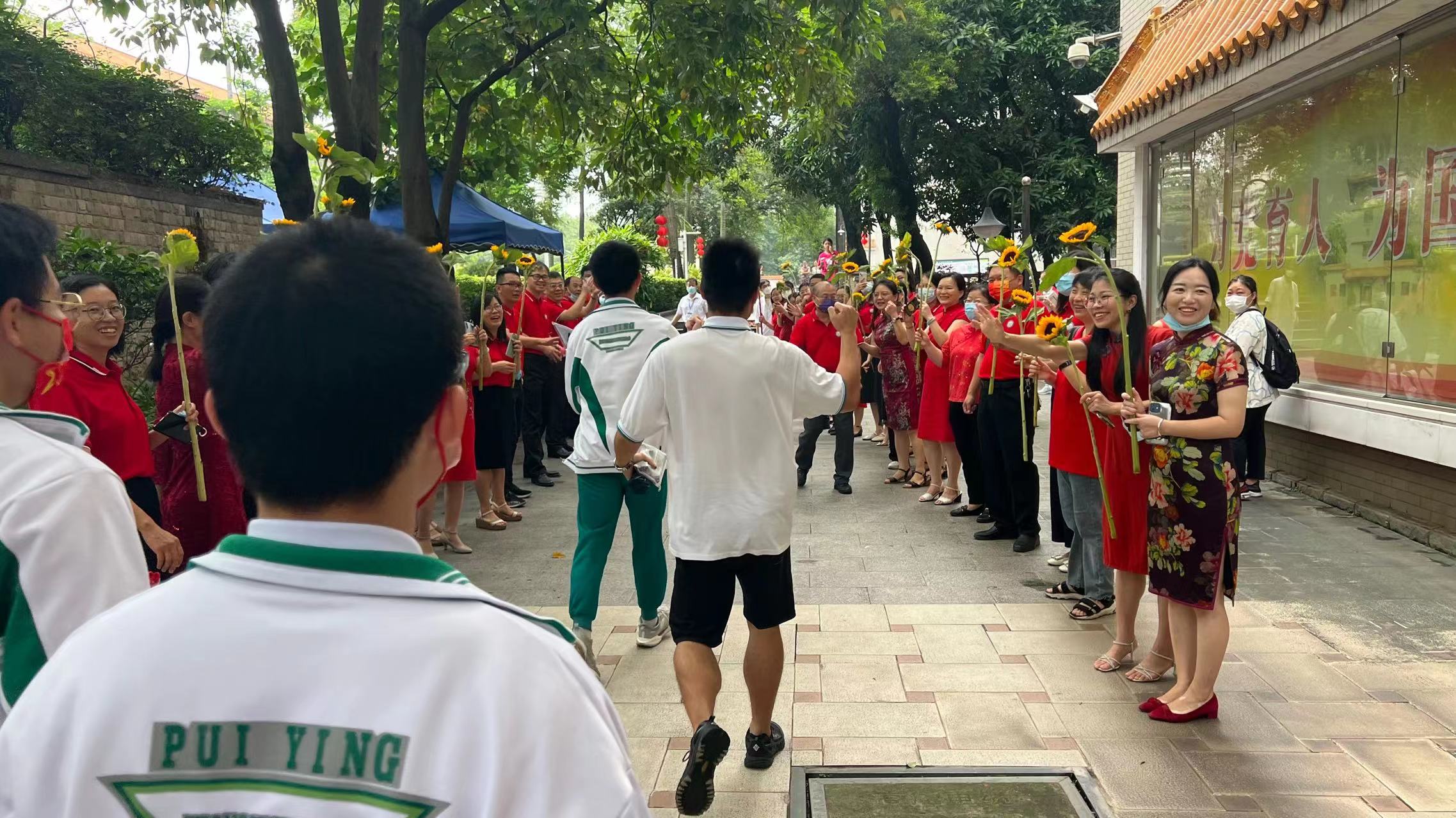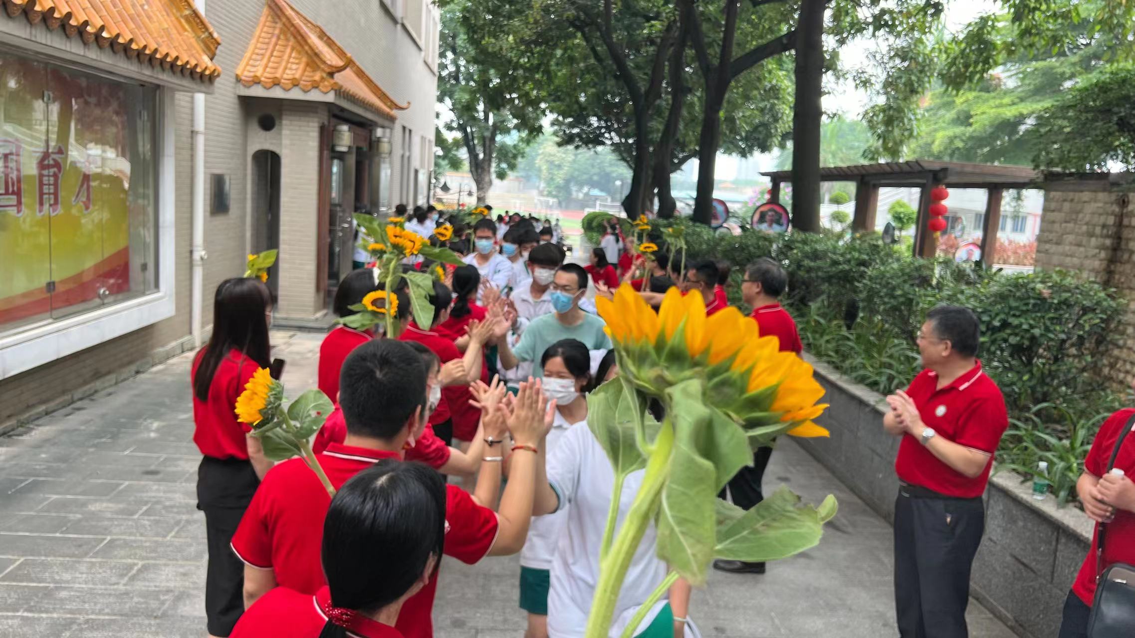 在培英中学科学馆北门出来,前往考场的必经之路上,列队送考的老师们身着喜气洋洋的红衣、红裙,与经过的考生们击掌相庆,为大家加油鼓劲。老师每人手持一支绽放的向日葵,还有一位老师高高举起一串粽子,祝福大家“红”(鸿)运当头、沉着应考,一举夺“葵”(魁)、金榜高“粽”(中)。