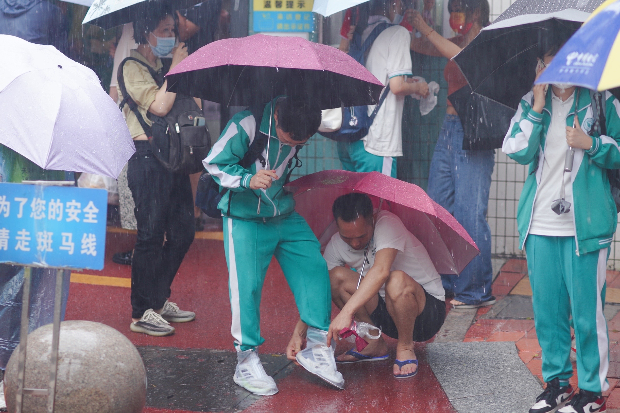 随着考生逐渐离开考场,现场出现暖心一幕,由于雨势较大,有家长俯下身子为刚结束考试的考生穿上鞋套。也有不少本校考生选择留在学校吃饭午休,补充能量迎接下午的考试。