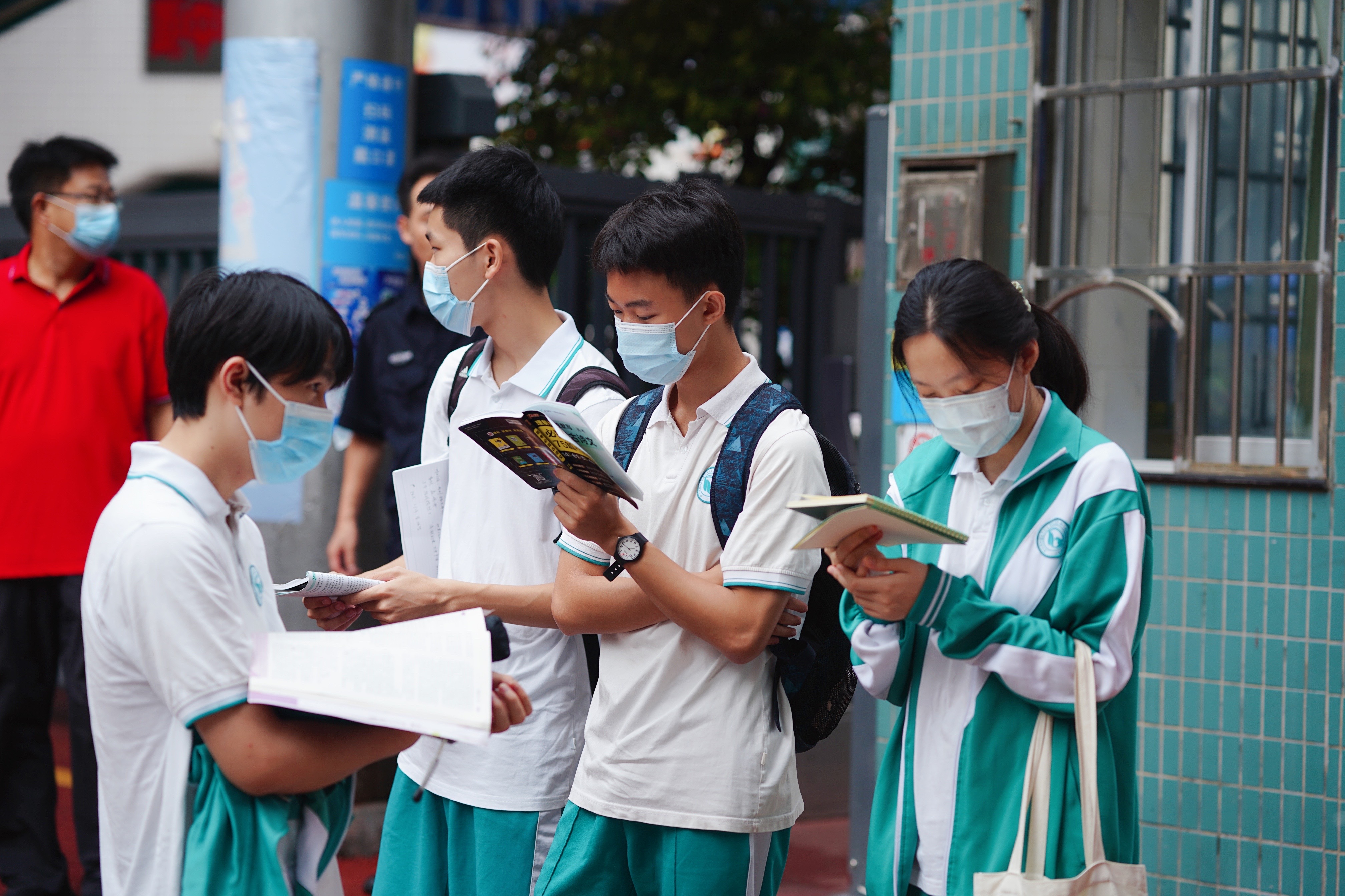 上午7点30分,在广州市第一一三中学东方校区考点,已有不少高考考生抵达,记者在现场看到,有不少考生在抓紧进场前的最后时间复习,也有的考生心态放松,和老师同学互相加油打气。