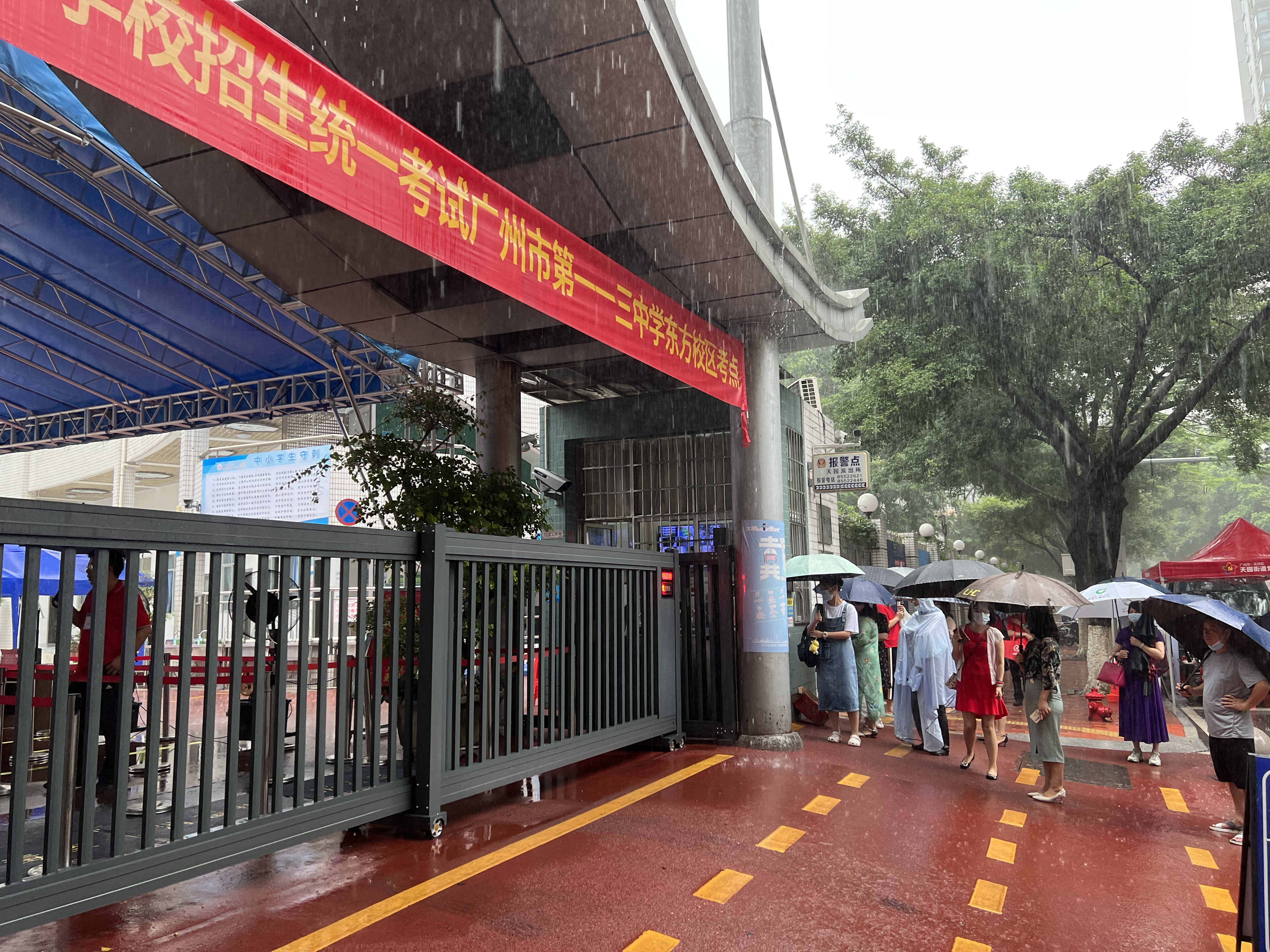 上午11点30分,首场考试结束,家长和老师迫不及待地打着伞在校门口迎接考生。考点雨势较大,学校内搭有雨棚,确保考生从考场到校门口都不会淋雨。