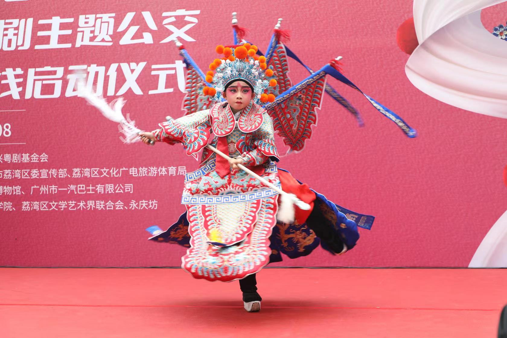 仪式现场,荔湾区粤剧非遗传承人、粤剧艺术博物馆少儿粤剧传承基地老师唐沛文、广东省粤剧院优秀演员许文杰为观众精彩演绎了粤剧唱腔报站“8路顺风”的片段。
