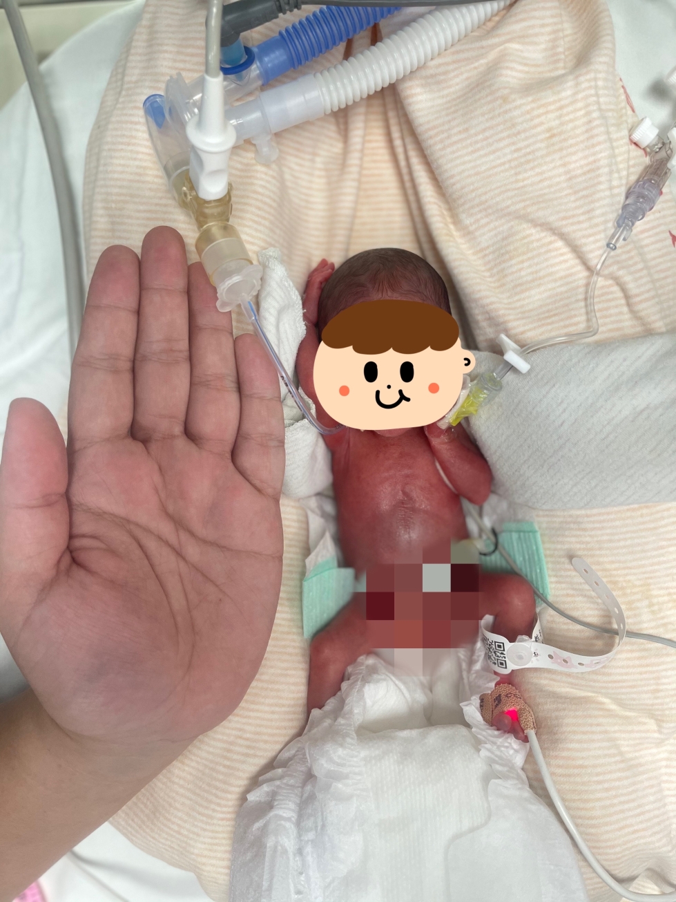 2022年2月24日,一对胎龄只有26+5周的双胎宝宝来到这个世界。出生时姐姐小甜(化名)890克,而妹妹小馨(化名)仅438克,还没一瓶矿泉水重,身长、头围分别只有28厘米、22厘米,成人手指比她胳膊还粗,巴掌比她个头还大。姐妹俩体重相差约一倍,救治难度极大。