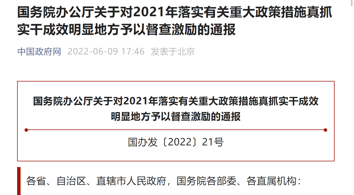 6月9日,中国政府网发布消息,国务院办公厅近日印发通报,对2021年落实打好三大攻坚战、深化“放管服”改革优化营商环境、推动创新驱动发展、扩大内需、实施乡村振兴战略、保障和改善民生等有关重大政策措施真抓实干、取得明显成效的199个地方予以督查激励,相应采取30项激励支持措施。