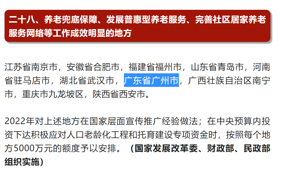 通报内容中,广州在养老兜底保障、发展普惠型养老服务、完善社区居家养老服务网络等工作成效明显,被点名表扬。国务院2022年将在国家层面宣传推广广州经验做法;在中央预算内投资下达积极应对人口老龄化工程和托育建设专项资金时,按照5000万元的额度予以安排。