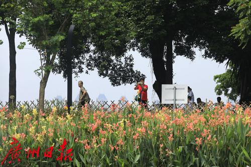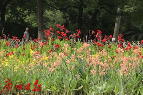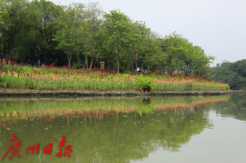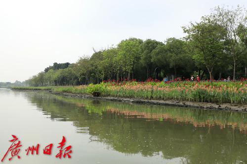 位于广州南中轴线上的海珠湿地,占地1100公顷,海珠湿地各种果树和植物非常丰富。时下正是鸡蛋花、美人蕉、大叶紫薇等各种花卉盛开的时节。在海珠湿地公园石榴岗河b河边,前两年种植的成片美人蕉沿河岸绽放,红黄两色的花瓣在绿树下显得格外醒目。