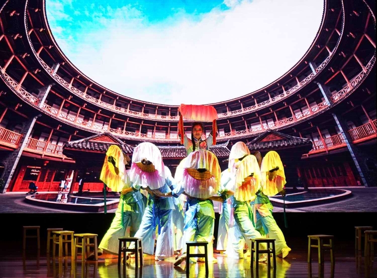 客家女子舞蹈《客家情》,以精美绝伦的舞蹈和舞蹈风格再现了客家女孩子婚嫁前婚帽制作的心路历程,舞蹈活泼轻快,充满了昂扬的生命之美。