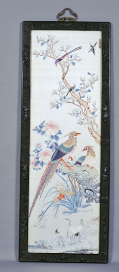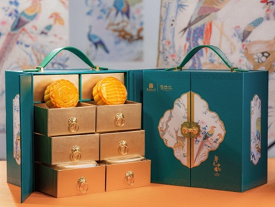 广州博物馆藏“清·红木雕八仙框白缎绣花鸟纹挂屏”是国家一级文物,采用传统广绣钉、拼、堆等针法,四幅内容分别以孔雀、凤凰、锦鸡、梅花鹿为主体,边框以“卐”字纹,团寿为地,其上为雕刻八仙人物及“福禄寿”。在“鹿鹤同春”画幅的左下角,绣有“广东”、“绣庄彩元”字样,为清代贡品。今年,广州博物馆以此挂屏为创造灵感,将文物图案运用到月饼礼盒中,提取孔雀、凤凰、锦鸡及梅花鹿等元素,搭配碧绿色外观和精致黄铜锁扣装饰,再次携手中国大酒店隆重推出消失的月饼第二季“粤色中国·月光宝盒”文创月饼。