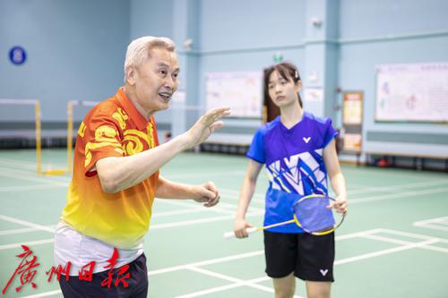 广州羽毛球队现在的训练基地正是在中心的两个球馆内,傅指导接受完采访,迫不及待地观看徒孙们训练。广州队总教练杨新芳纠正道,不仅是徒孙,这些10多岁的队员应该是曾孙辈了。看完训练,傅指导找来一把球拍,开始指导“曾孙们”。杨新芳笑眯眯地站在一旁看着,她告诉记者,即使退休多年,傅汉洵和曾秀英现在还不时双双散步回到广州队,他们一辈子都在为广州羽毛球事业奋斗。队员们也特别珍惜傅汉洵夫妇回来指导的机会。