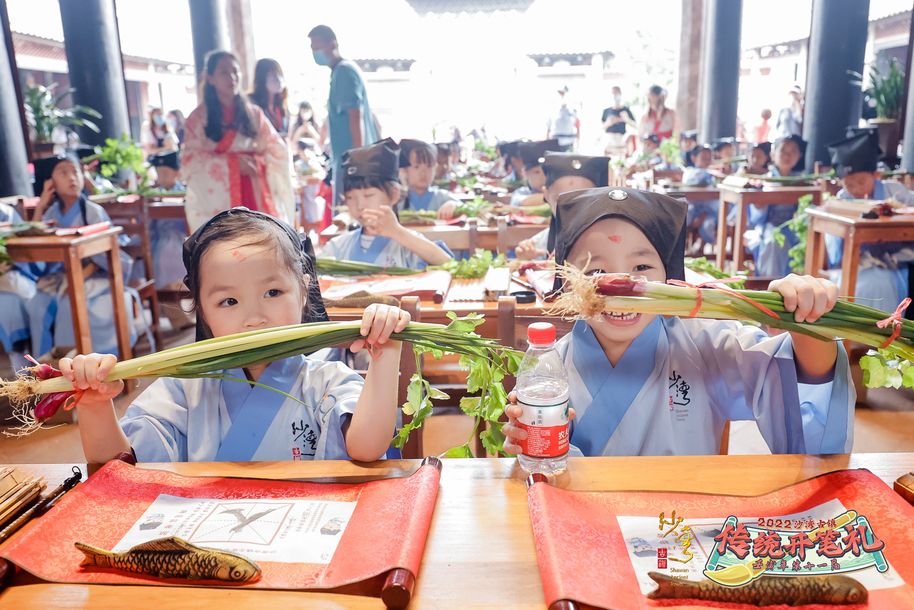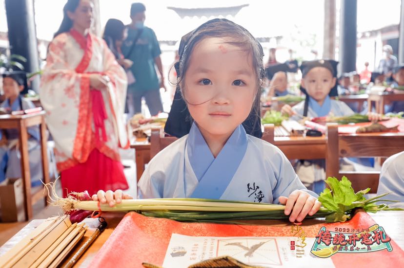 开笔礼活动寓意“萌娃”们志存高远、梦想闪亮,他日一飞冲天,独占鳌头。当天,随着司礼官梁谋先生一句“正衣冠”,活动拉开帷幕。50名“萌娃”进行开笔礼仪式,“击鼓明志,茅塞顿开”司礼官的擂鼓声,将本次活动气氛推上了高潮。小朋友在参加活动中,通过司礼官教导,学会尊师重道;通过互帮互助、建立友谊;通过体验传统文化,让“人生第一课”更有意义。而用毛笔手写第一个“人”字,代表着要读书首先学会做人,这正是开笔礼要传达的核心内容,也是沙湾古镇在推广“旅游+文化”“旅游+教育”的一大亮点。