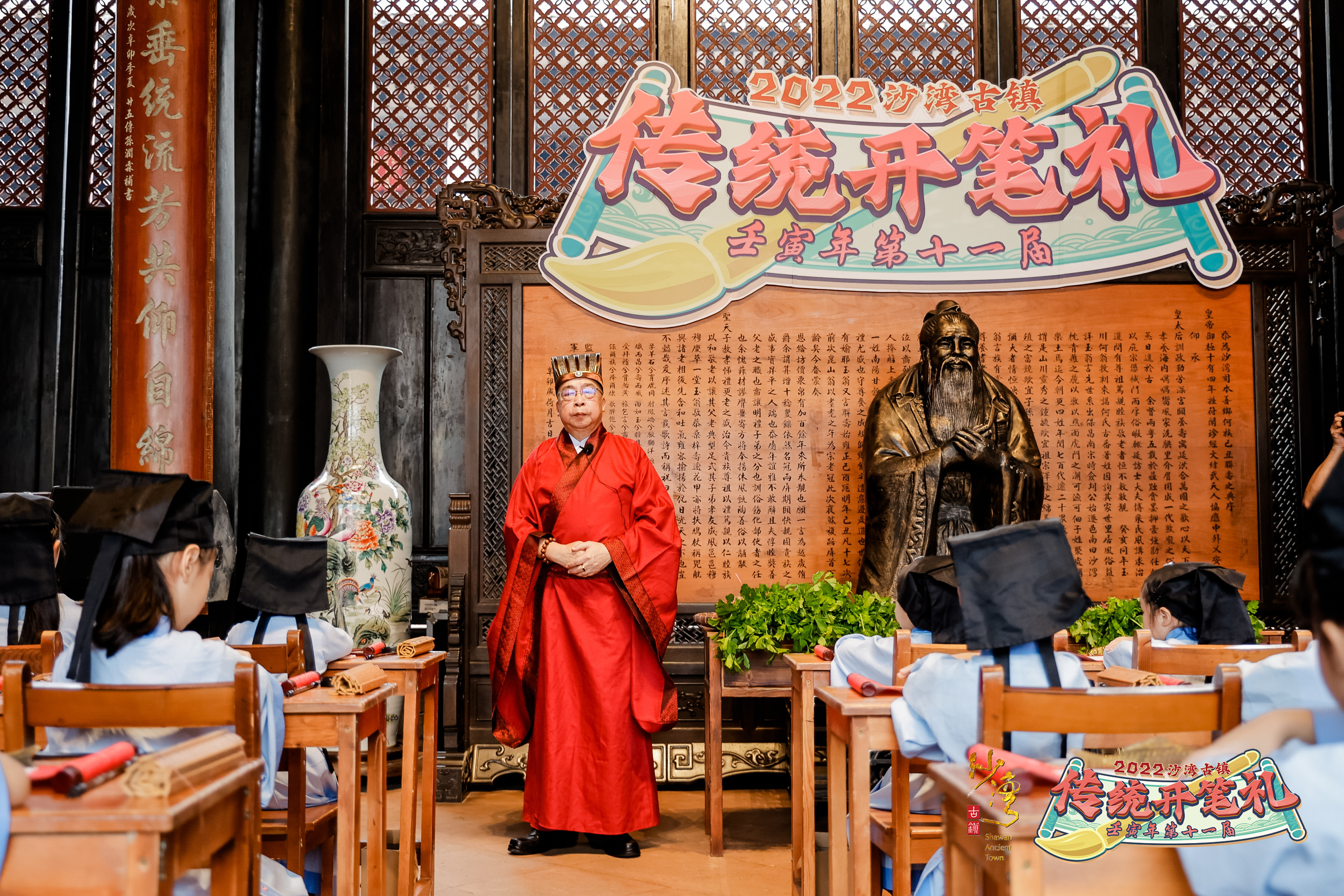 锣鼓喧天,娃娃欢声响遍天,文脉古镇,耕读传家耀沙湾。6月12日上午,番禺区沙湾古镇壬寅年第十一届传统开笔礼散客首场活动在沙湾古镇全国重点文物保护单位——留耕堂内举行。