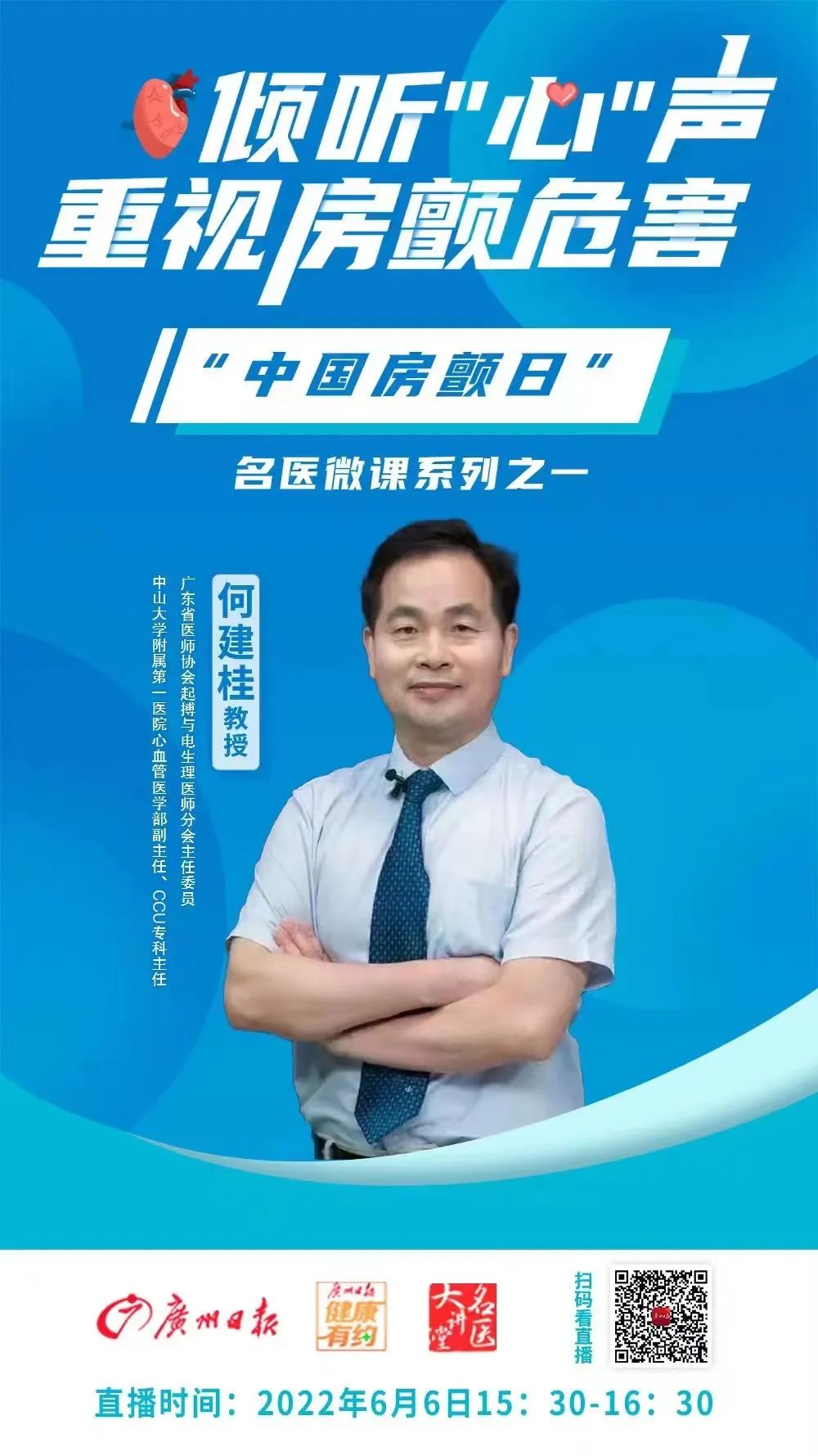 6月6日是第10个“中国房颤日”。广州日报健康有约名医微课特别推出了房颤专题的系列微课。作为系列微课的第一期,6月6日15:30~16:30,做客直播间,来为我们打头阵的是中山大学附属第一医院心血管医学部副主任、CCU(心脏重症监护室)专科主任何建桂教授,一起来听听他说了什么吧!