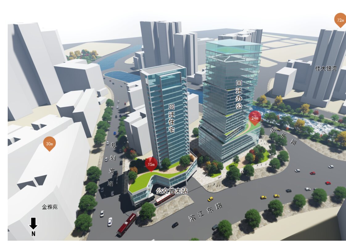 目前地块周边现状建筑密度高、设施陈旧、公共空间匮乏。控规提出,利用轨道交通站点建设契机,在保障回迁的同时,推进城市公共空间品质提升,促进地块周边规划道路拓宽实施。根据规划,地铁站上盖将建一栋80米高的广州打捞局回迁办公楼,一栋70米高的回迁住宅。在城市天际线方面,现状临江一线建筑塔楼高度72~140米,项目原建筑高度50米,优化后为80米和70米,城市空间基本维持不变,不破坏现有城市界面。