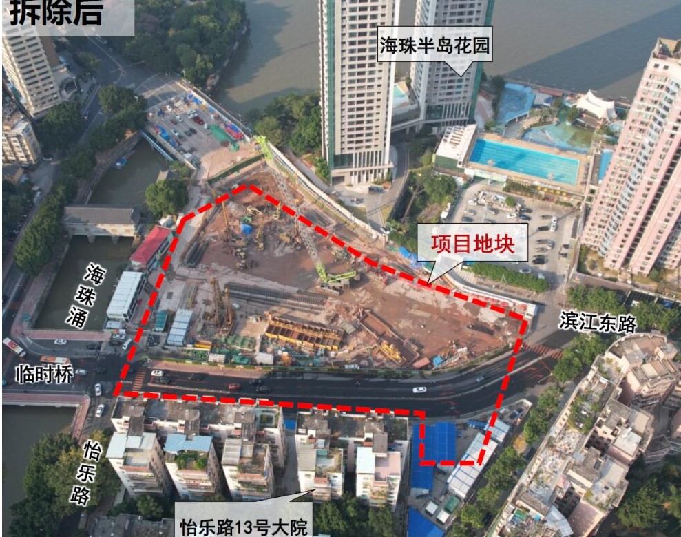 广州地铁10号线计划于2023年完工,目前滨江东路站正在围蔽施工。地块内拆除前为广州打捞局和公交站场的办公及住宅,为了支持地铁10号线的建设,广州打捞局、市公交集团和滨江东居民配合滨江东路站工程征拆,2021年7月,滨江东路站涉及地块已拆除平整。与此同时,根据2021年《广州市地铁十号线海珠区滨江东路站工程国有土地上房屋征收摸底、调查结果信息公告》,居民回迁意愿强烈。市规委会上提出,需加快落实征拆回迁需求,保障轨道工程建设。