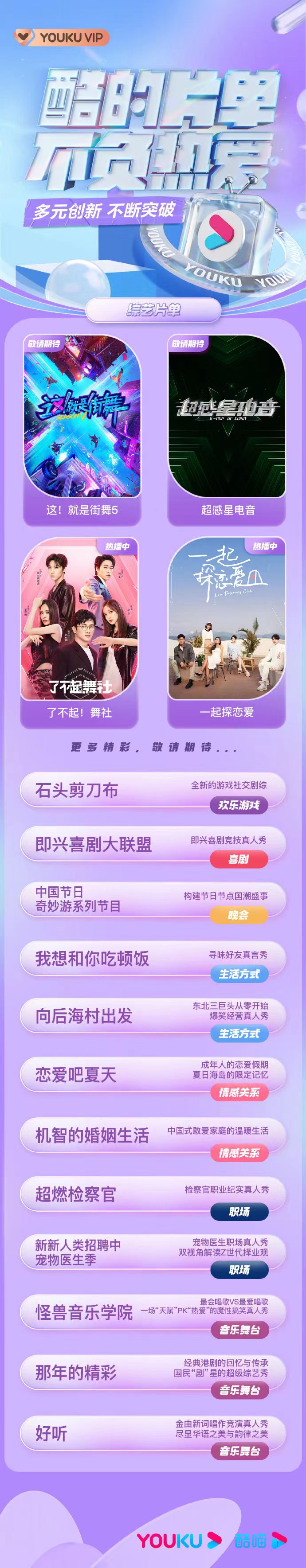 综艺方面,《这!就是街舞》第五季定位国际新秀交流赛,向世界传递街舞的体育竞技精神和中国街舞文化魅力。该板块还包括星素互选音乐竞演综艺《超感星电音》、致敬经典IP的实景体验真人秀《石头剪刀布》等。