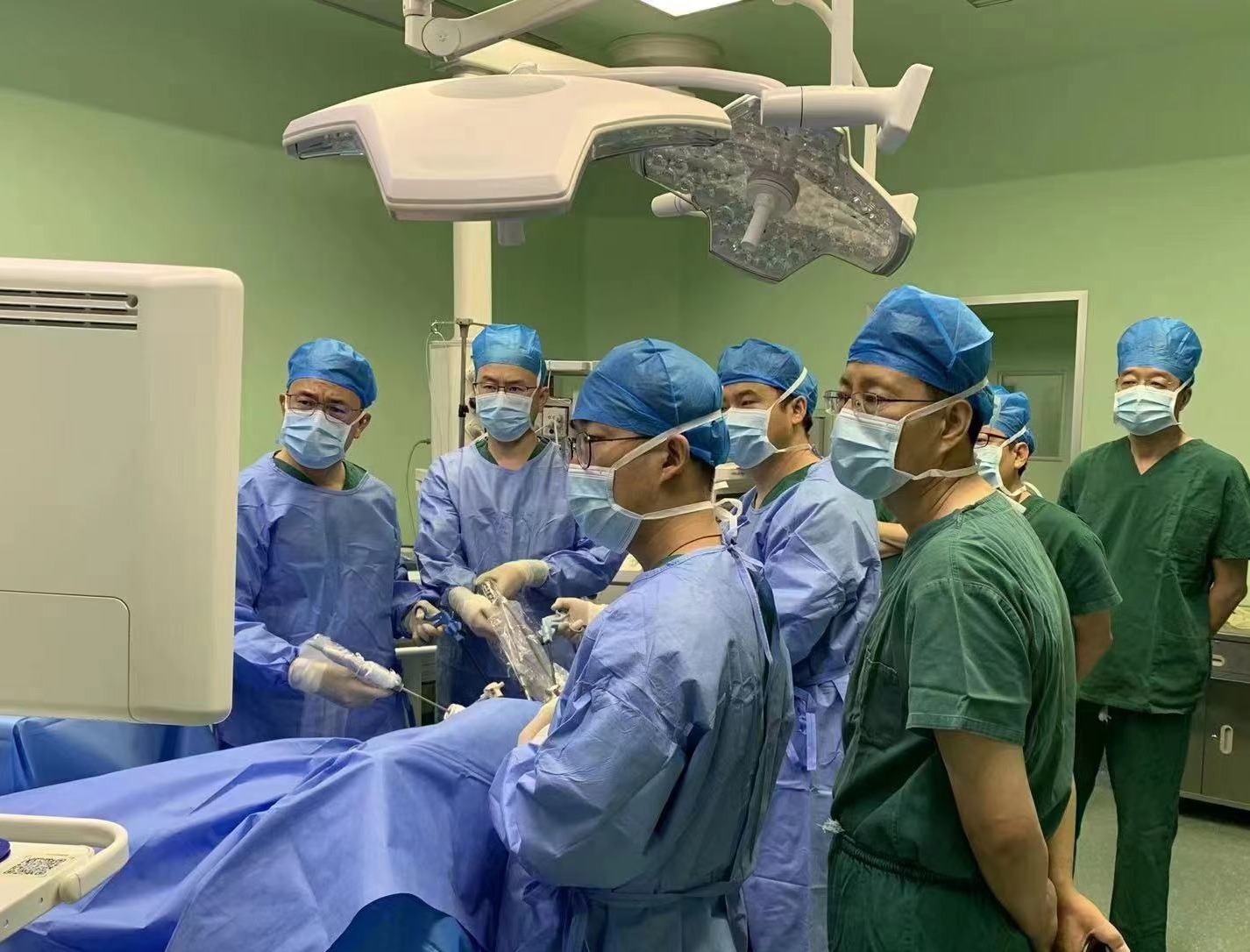 手术前,手术麻醉科副主任谢敬敦和甘肿麻醉科王海东主任提前为患者施行麻醉,为手术的顺利进行做好充分准备。由于患者年龄较大,化疗后盆腔充血明显,骨盆异常狭窄,且肿瘤较大、位置较低,手术难度较大。中肿潘志忠教授、谢敬敦副主任与甘肿赵晓宁主任手术团队、王海东主任麻醉团队的通力合作,手术持续近5小时,直到凌晨才结束,过程非常顺利,为这位高龄患者圆满完成了保肛手术。