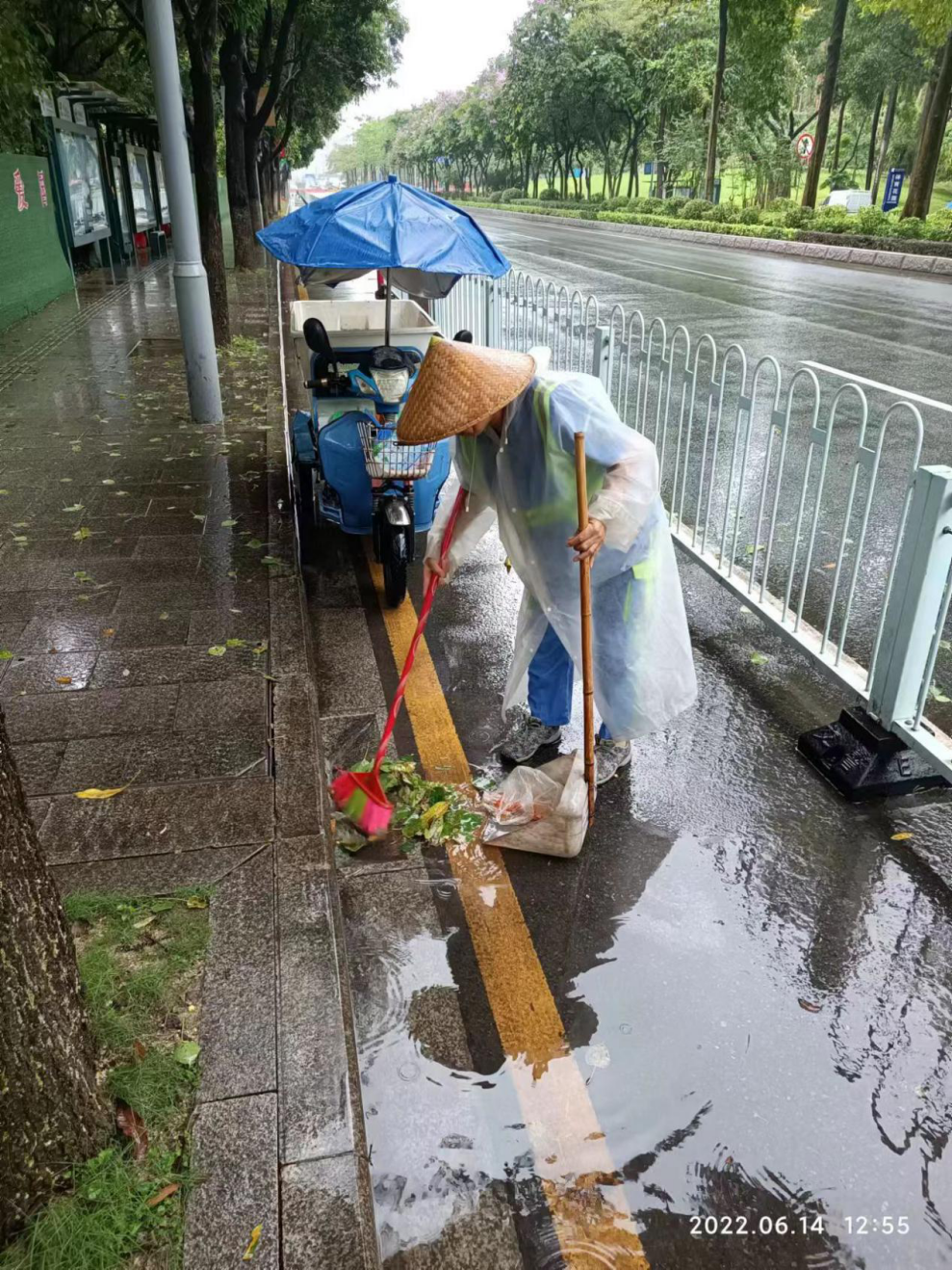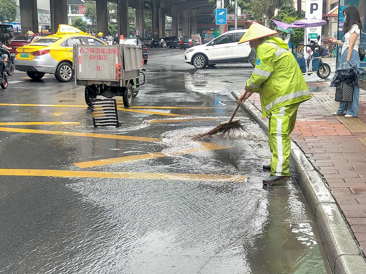 白云区城管部门专门下发加强汛期市政道路雨水口清洁工作的通知,指导各环卫保洁单位重点加强路边侧石位、低洼或易积水路段雨水口清洁和巡回保洁力度,确保雨水口不积存树叶、泥沙、生活垃圾等杂物。要求强降雨过后立即组织环卫工人清扫路面、沙井及排水口周边垃圾,及时清理路面积水,确保道路畅通。提前摸底汇总区管道路103个沙井(排水口)堵塞情况,协调水务部门督促排水公司跟进清堵。并指导辖内各单位就内涝黑点、易积水、堵塞等问题与水务部门做好沟通对接。