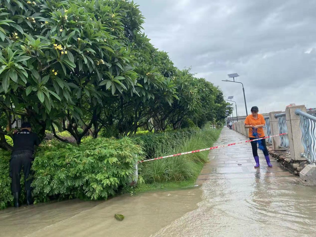 另外,由于连日暴雨以及天文大潮叠加,珠江水位快速上涨,江水漫过白云儿童公园河岸造成水浸,最大水深达20厘米。该局出动公园管理和辅助人员13人,迅速用警示带围蔽所有6个水浸区域以及滨江长廊,张贴警示牌。并安排管理人员分片值守,保安人员加强区域巡查,劝导游客注意安全。