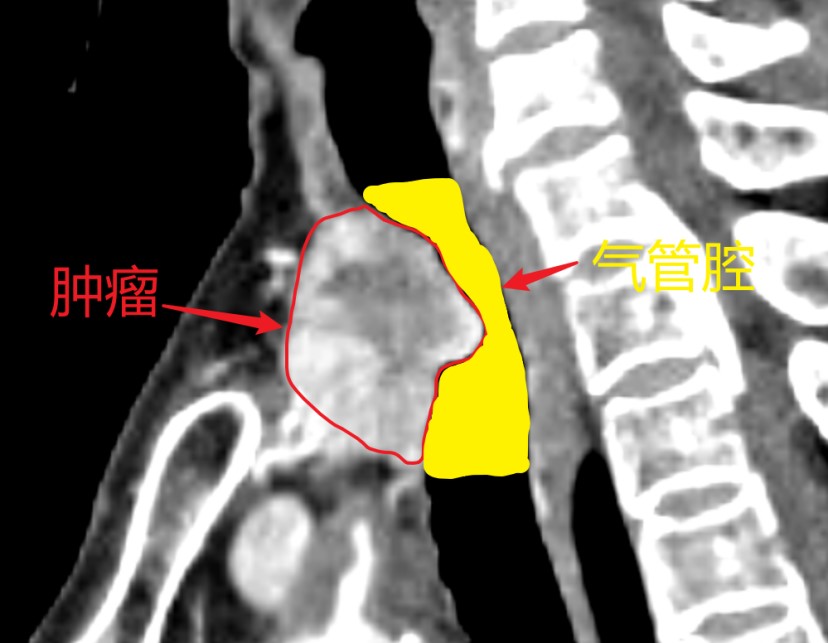 陈炬教授指出,刘阿婆的肿瘤大小为42毫米,已经压迫并且突破气管壁、长入气管腔内,气管腔最窄处约2.5毫米(如图所示)。