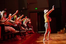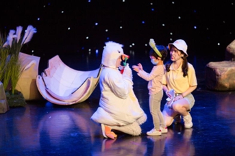 具体来说,观众需要通过旁白、动作、声音来推动台上整个故事的进展,用鼓励让那只出生在鸭群的小天鹅闯过一个一个的难关,一步一步找到自信,飞向蓝天。同时,演出过程中还加入了主持人姐姐,带领一帮现场临时组建的小主持人团队,在故事进展的各种关键时刻,引导现场的孩子们做出对主角表演的互动响应。