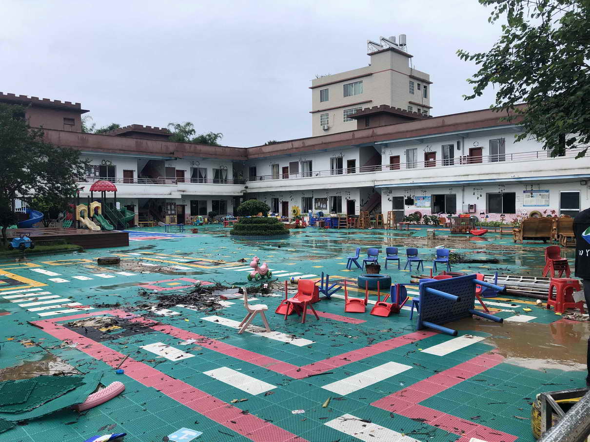 洪水退去后,南浦大拇指幼儿园的老师们也迅速返岗,脚穿水鞋,手拿高压水枪和扫把全力清除堆积的淤泥。据幼儿园负责人介绍,此次洪水淹过了园内的一楼窗台,课室桌椅和墙上的装饰物都受到浸泡,操场上铺设的地坪和娱乐设施等都损毁比较严重,所幸园内118名师生及时得到转移,接下来需要重新购置相关的教学设施。
