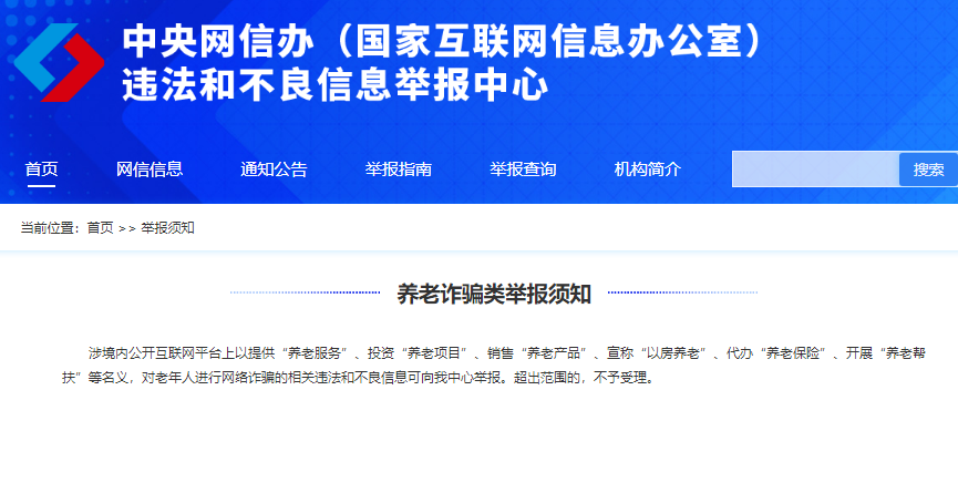 专题还开设“涉养老诈骗网上有害信息举报专区”,链接相应举报专区入口,接受养老诈骗类举报。举报须知称,涉境内公开互联网平台上以提供“养老服务”、投资“养老项目”、销售“养老产品”、宣称“以房养老”、代办“养老保险”、开展“养老帮扶”等名义,对老年人进行网络诈骗的相关违法和不良信息都可通过此专区进行举报。