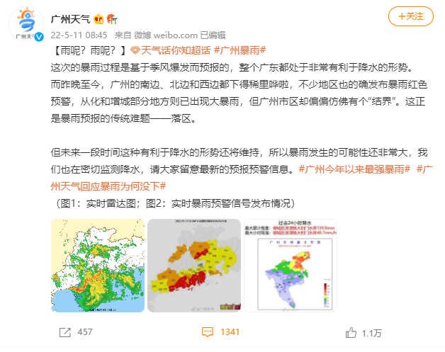 5月上旬,广东省气象局预计5月10日-13日广东将有大范围的暴雨到大暴雨、局地特大暴雨降水过程,本次过程可能是广东今年以来强度最强、范围最广、持续时间最长的强降水过程,各部门纷纷发出预警信息,#广州今年以来最强暴雨#、#广东今年以来最强降水来袭#、#今年入汛以来南方最强降雨来了#等话题在社交平台上持续走热,部分还登上了热搜,网络调侃“暴雨气氛已烘托到位”。而11日暴雨并未如期而至,许多网友提出了“雨没有想象那么大”的疑问。“广州天气”迅速发博回应原由,博文获得了1.1万人次的点赞,#广州天气回应暴雨为何没下#登上热搜,获得了1.7亿的阅读量。同时,@广州天气还在评论区积极回复网友留言,继续解释网友提出的疑问,专业的释疑和积极的态度得到了网友的广泛理解和好评。