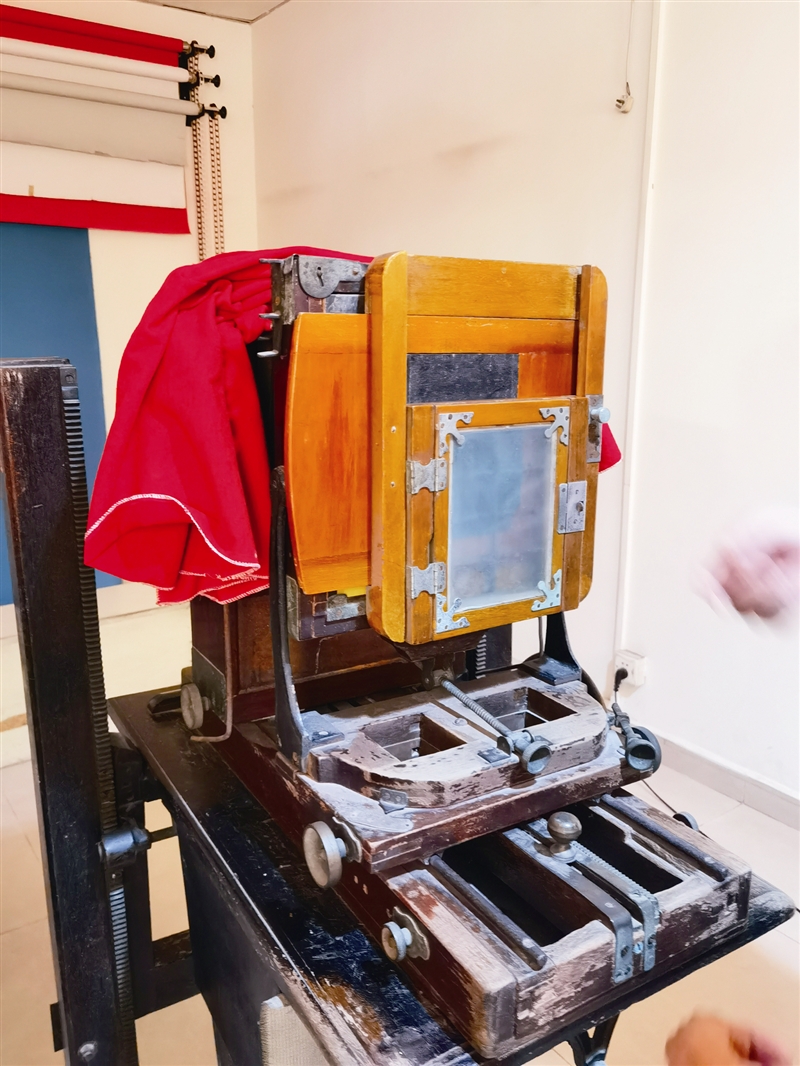 “座楼机有一个底片盒,我们一开始用的是玻璃底片,很容易摔坏,到后来改用了柯达公司的胶片。拍照前,我们会根据客人需求,套入对应的相片框,里面有个小窗口可以看到倒立的影像,手动对好焦之后,盖上红布,然后按下连接在机旁边的快门线,瞬间就被定格了。”黎焯勋说。