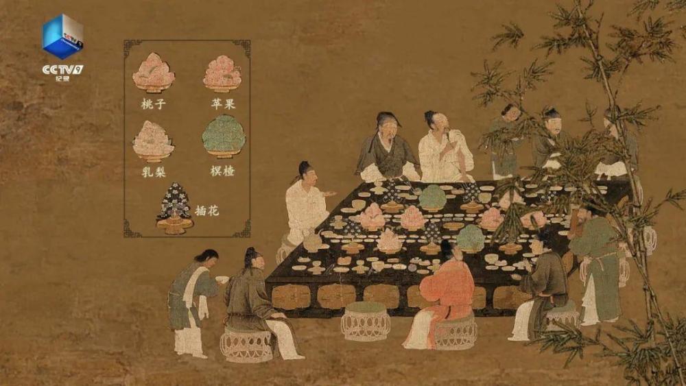 这幅《文会图》描绘的是宋朝文人雅士品茗雅集的场景,相传是宋徽宗亲笔所绘。食案上那诱人的“珠花看果”都是什么呢?