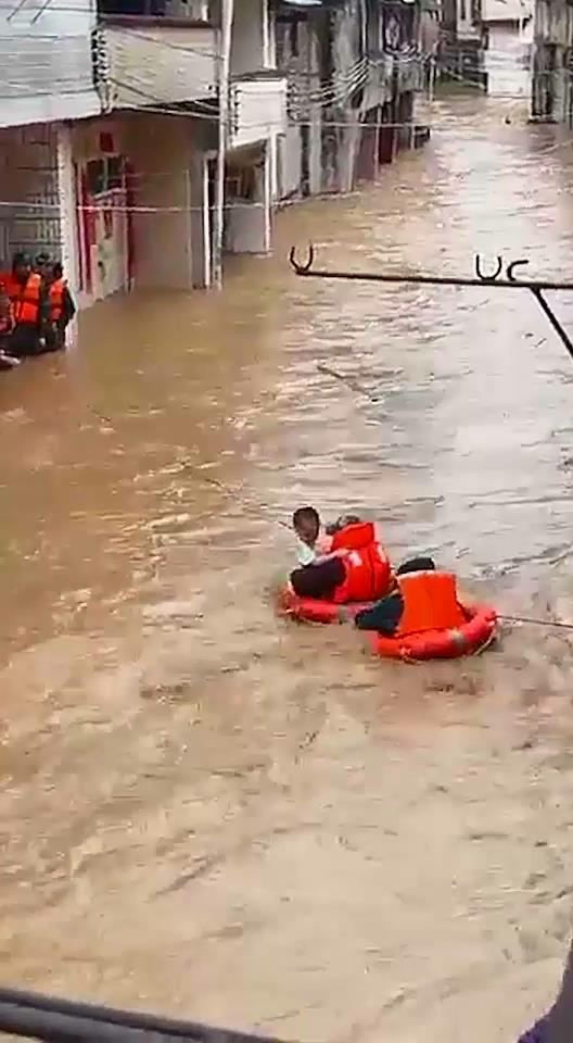 18日晚8时到19日8时,韶关市始兴县出现暴雨、局部大暴雨,平均降雨量68.8毫米,最大雨量出现在太平镇北山站100.9毫米。强降雨导致县城多处出现内涝,隘子、司前、深渡水等多个乡镇不同程度受灾。在深渡水乡,救援人员在过腰的浊流中拉起绳索救助转移群众。