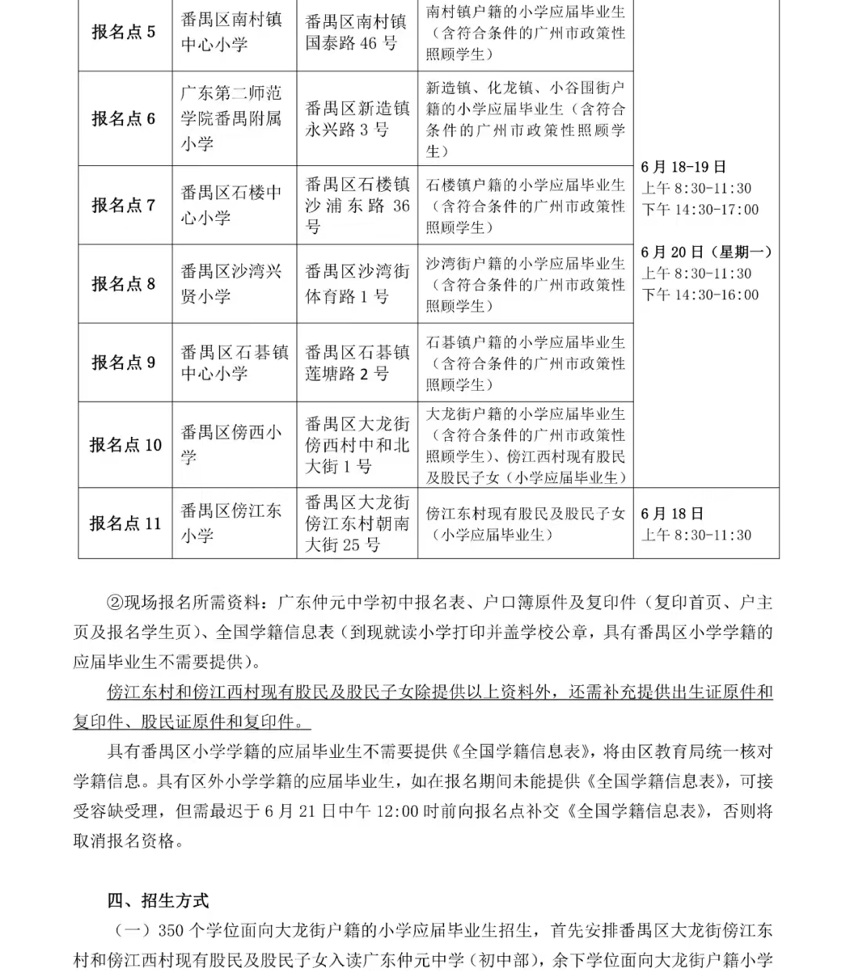 (一)350个学位面向大龙街招生,首先安排番禺区大龙街傍江东村和傍江西村现有股民及股民子女入读广东仲元中学(初中部),余下学位面向大龙街户籍的小学应届毕业生招生。
