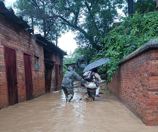 巡至松山街道三村路口时,听到有群众呼叫救命,宋常龙带领5名退役军人志愿者赶往现场,随即采用肩背手抱的方式将老人、小孩、残疾人员成功转移到了安全区域,至13时已转移送老人、残疾人员、小孩约150人。