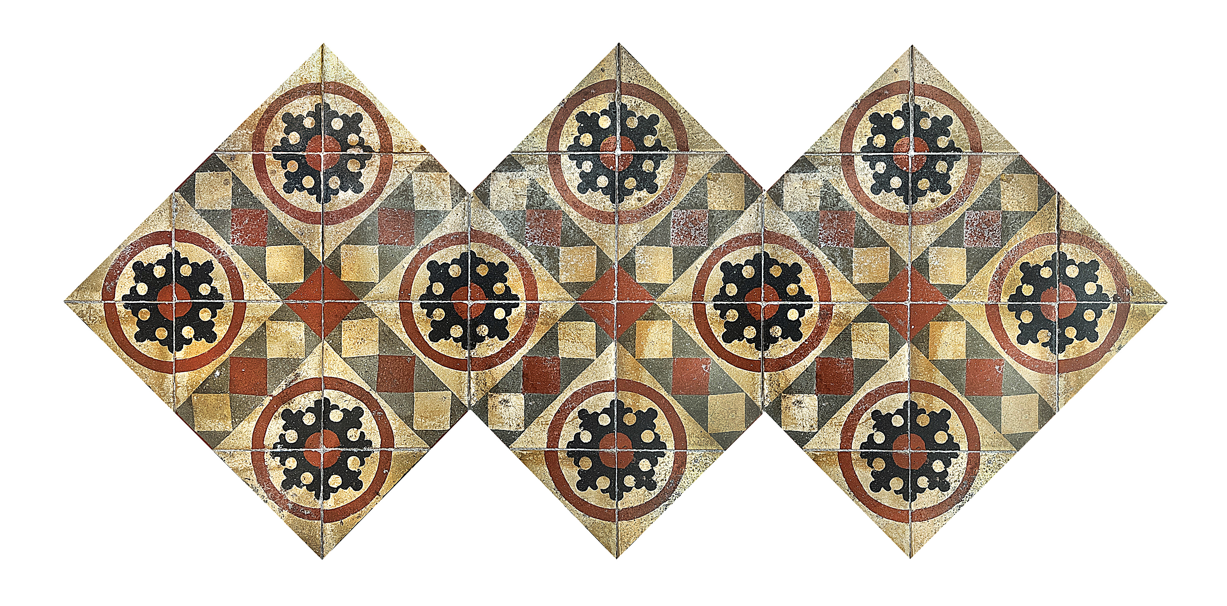 花阶砖整块整块地大面积铺设,一块块纹饰相同的阶砖组合在一起,靠近墙的位置铺上用作镶边的花阶砖,而四条镶边的拐角处那块花阶砖又经过专门设计,纹饰兼顾衔接水平和垂直方向的两块花阶砖。如此,整个房间地面组成了完整的花式,构成一幅美丽的画卷。