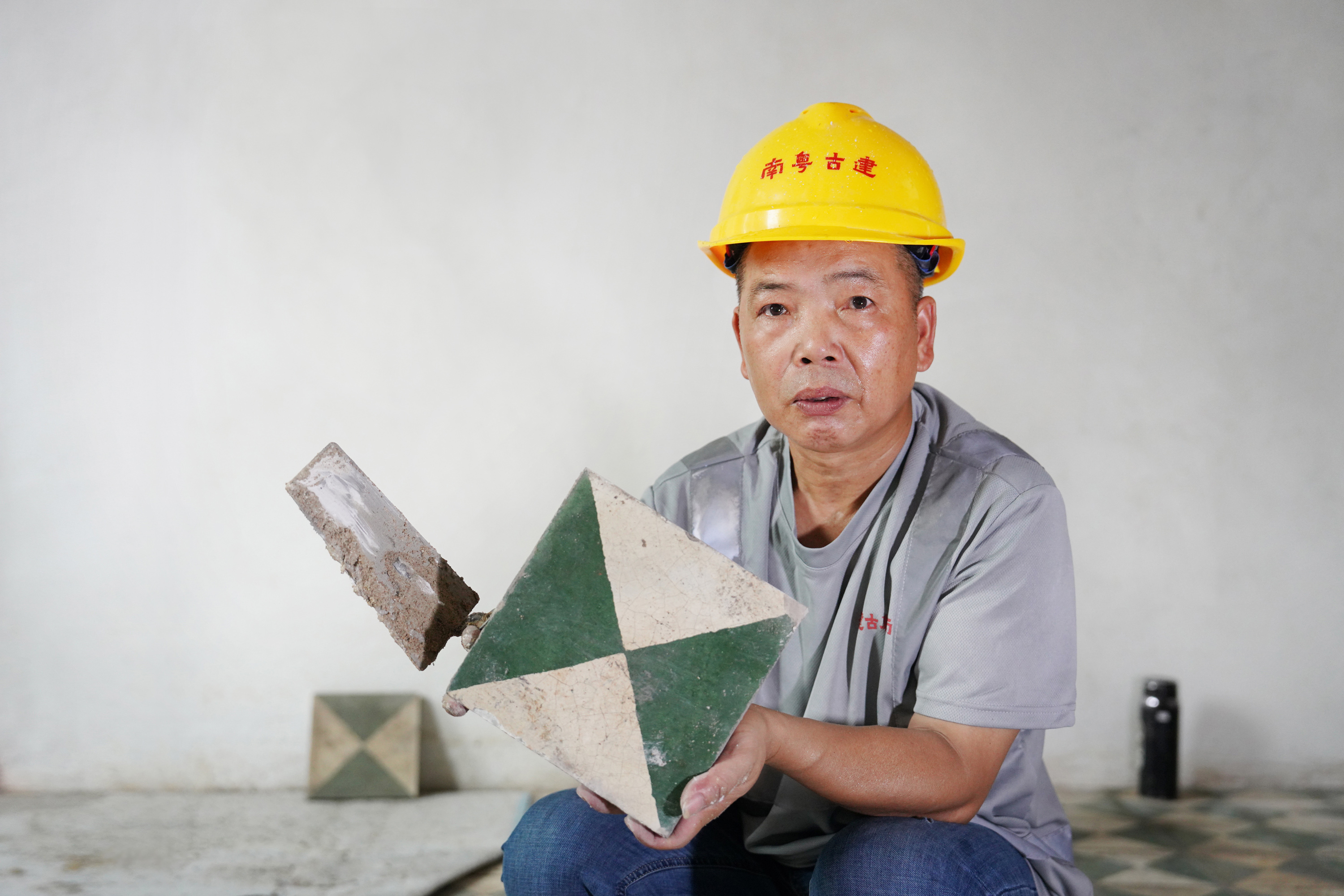 如今,这栋广州市历史建筑需重新修缮后对公众开放。修缮时要尽可能恢复每个元素的原样,包括踩在脚下的那一小块花阶砖。修复花阶砖的工序交给了拥有近40年从业经验的铺砖匠吴文进。