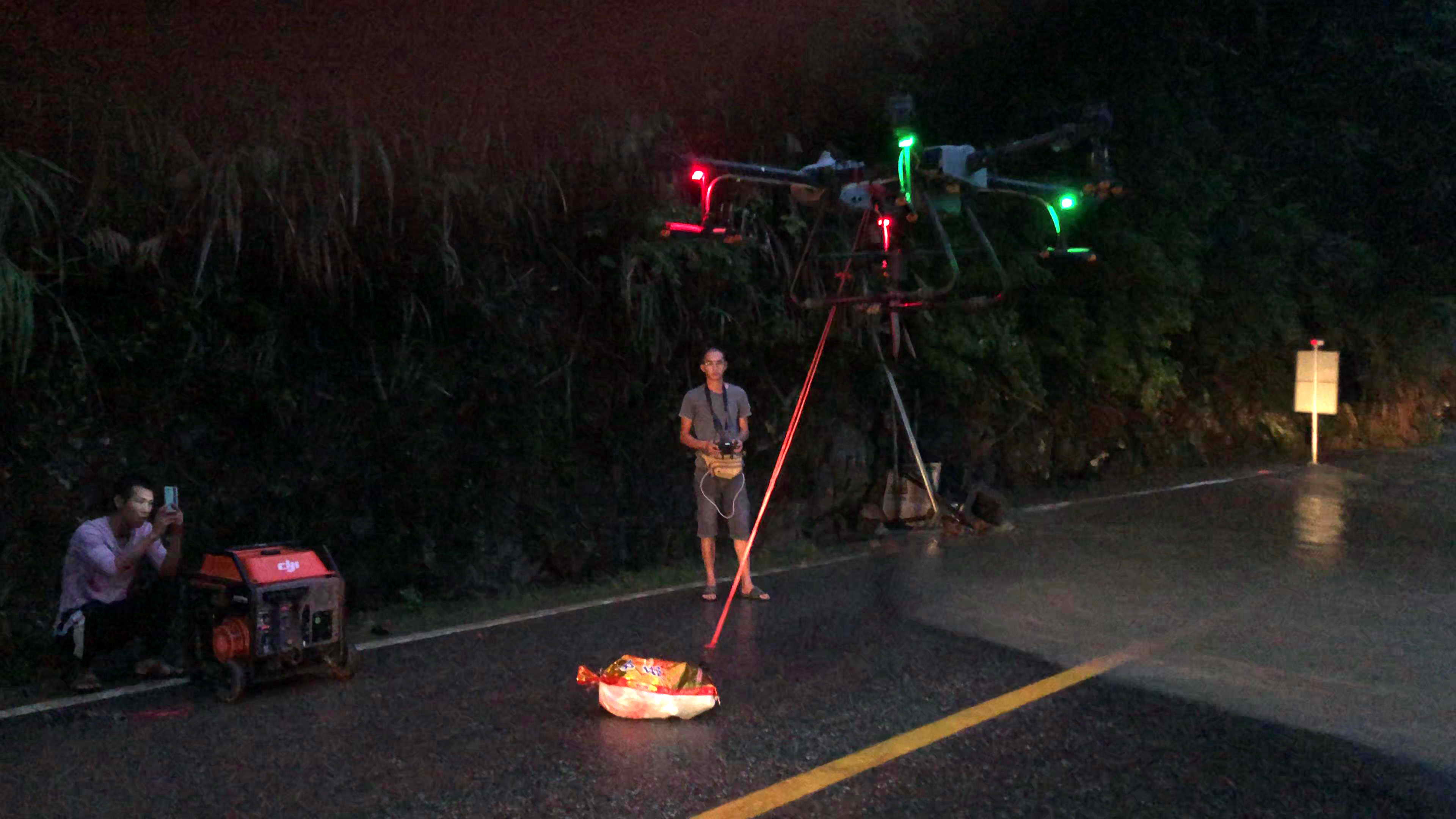 与此同时,深渡水瑶族乡禾花塘村的140位村民也因水流太大,被困村中,所幸所有人员安全没有受到威胁。为保障村民们的生活所需,始兴县紧急联系广源农庄调派农用无人机,对该村开展物资投送。在一切准备就绪后,傍晚6点,两架农用无人机搭载食物、水等物资送到村民们手中。