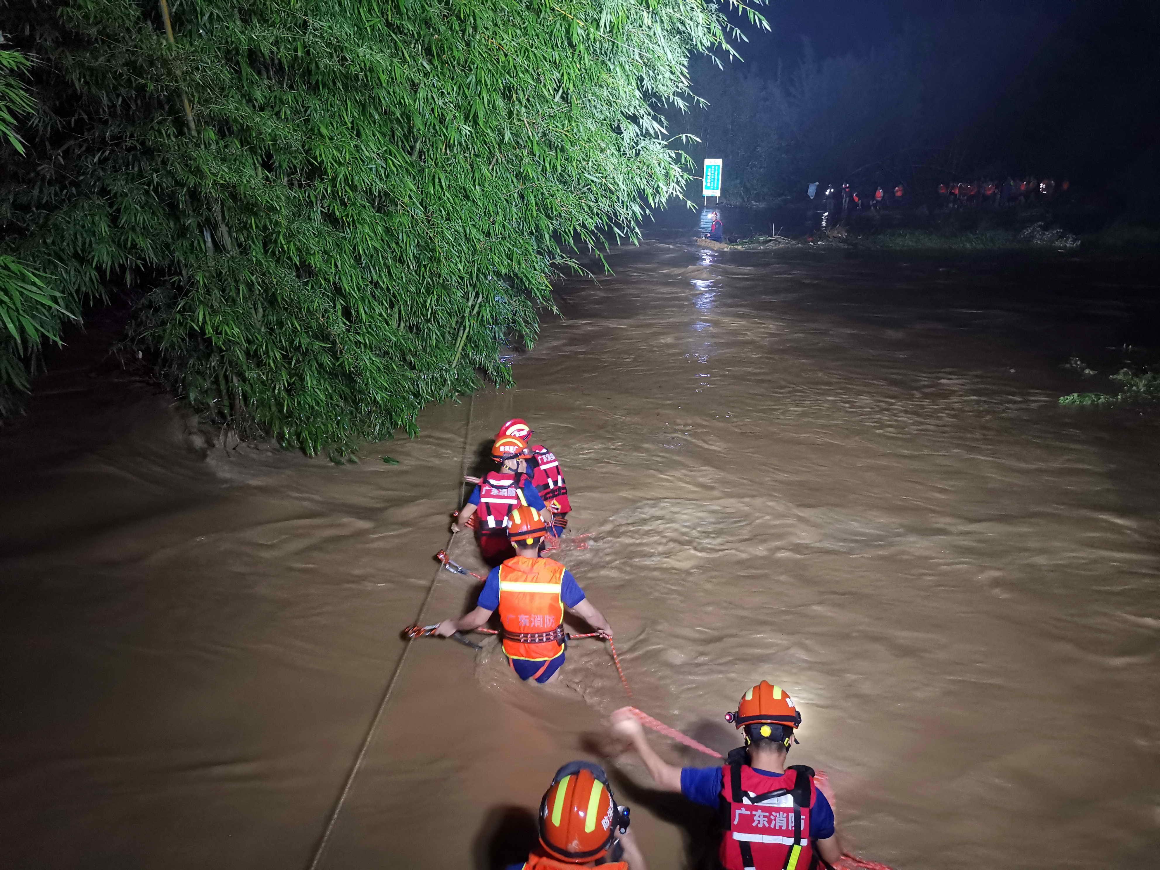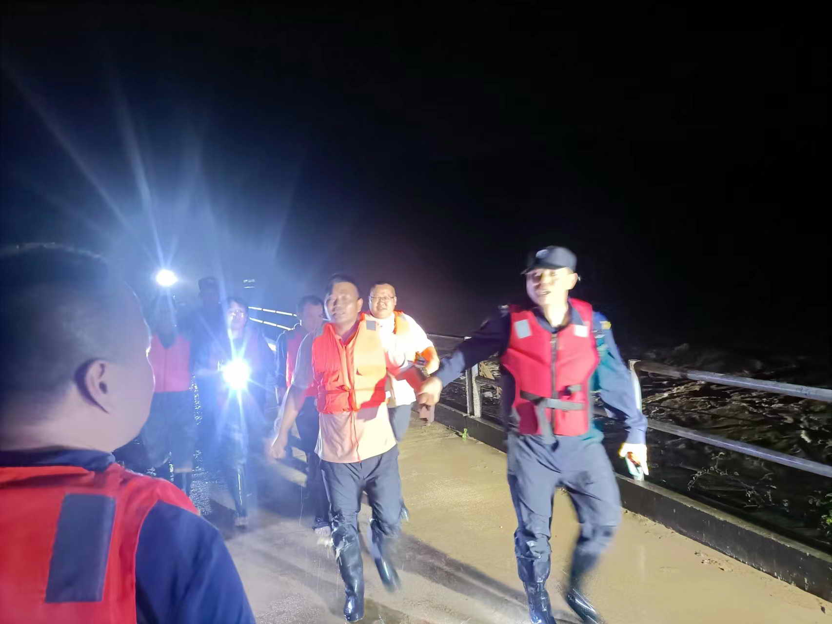 当天晚上8点半,河水开始退去,桥面已经显露出来,过水深度只有十几厘米。此时,可以开始前往对岸救援!随后,十几名救援人员头戴照明灯,穿上救生衣,带上安全绳索和救生衣,小心翼翼涉水通过桥梁前往对岸。为确保安全,在架好安全绳索后,救援人员分多批次护送被困群众。