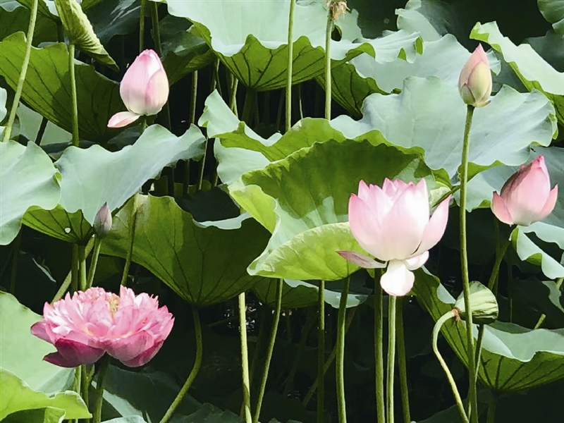 那一朵朵盛放的荷花,娇艳欲滴展风姿;那含苞待放的花蕾,静待蜻蜓立上头;那清香碧绿的莲子,像蓝宝石一样镶嵌在莲蓬上;还有那丰润滚圆的荷叶,既像个翡翠玉盘又像一把把大伞。放眼荷塘,好一幅沁人心脾的“荷花图”,充满诗情画意,令人无限陶醉和遐想……