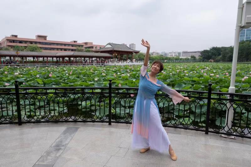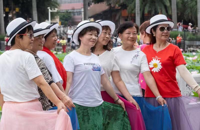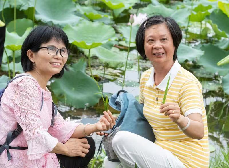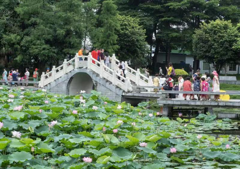 “我们是专门从海珠区过来赏荷花的,听说这里是广州市内最大的荷塘,前两天还有人拍到几支并蒂莲,我们一群退休姊妹就约着来了。”市民杨丽珍和姊妹们穿着靓丽的旗袍,带齐道具,在石桥上尽情拍照玩乐。“看着这么漂亮的荷花,大家都好享受!”杨丽珍说。