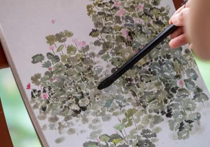 亭台轩榭里,石桥长廊上,甚至湖边有些泥泞的小路上,随处可见端着长枪短炮的摄影发烧友;盛装打扮,撑着油纸伞,手执绢布扇,摆着“甫士”拍照拍视频的“花粉”们;现场写生的书画爱好者,还有兴致高涨的游客临荷起舞,场面“墟冚”(粤语俚语,形容场面十分热闹)。